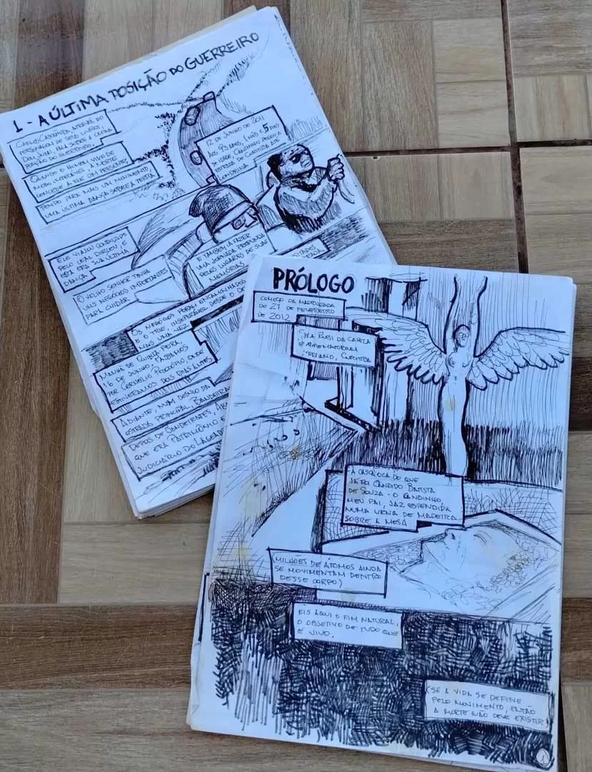 Pela extensão da pesquisa e intertextualidade entre as linguagens usadas pelo autor, todo esse material foi mantido reunido: esboços, estudos de personagens, anotações, originais corrigidos de próprio punho pelo protagonista, incluindo documentos pessoais do Candinho, álbuns de fotos, CDRs com os áudios das entrevistas e arquivos de texto com as transcrições, etc, e permanece neste acervo, à exceção dos esboços de um segundo fanzine inacabado, cujo “Prólogo” inicia no velório de Candinho e continua com “A última posição do guerreiro”. Este último material estará em poder da curadora para análise e cotejo dos vários roteiros advindos dessa extensa pesquisa.