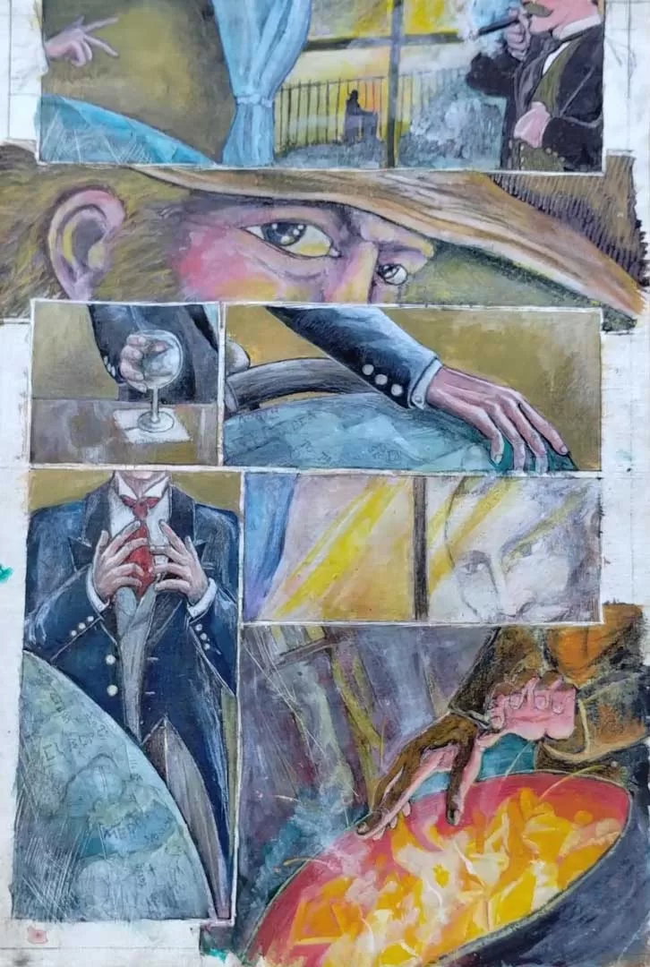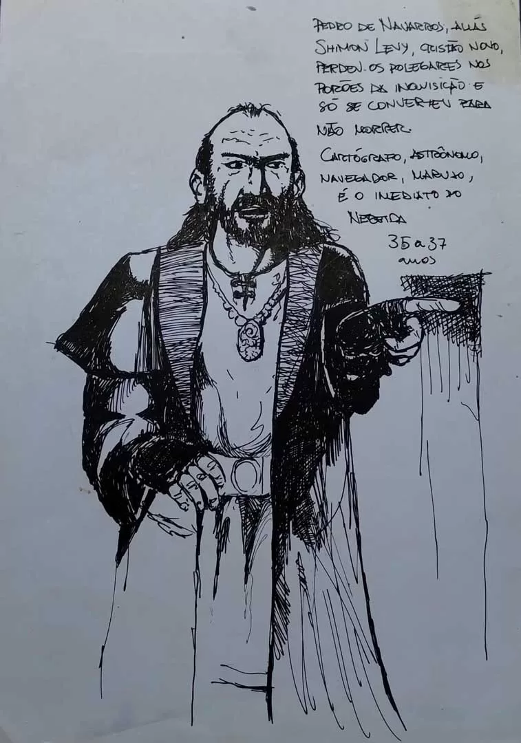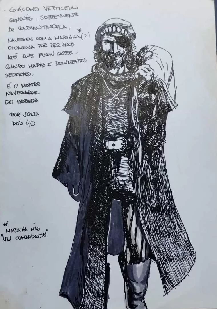 Talvez a maior das obsessões de Edu Tadeu, Gonzalo de Marvisante – genovês sobrevivente de Constantinopla – acompanhou toda a sua trajetória, ao menos desde o filme de ‘1492 – Conquista do Paraíso’, de Ridley Scott (1992). Transformou-se no conto ‘Chuva de Primavera em Bizâncio’, em várias pranchas de estudos e obras acabadas, seu email [marvisante@gmail.com], pseudônimo em alguns momentos e a carta de despedida de Gonzalo, um manuscrito dos anos 1990 que revela coincidências com a trajetória do autor.